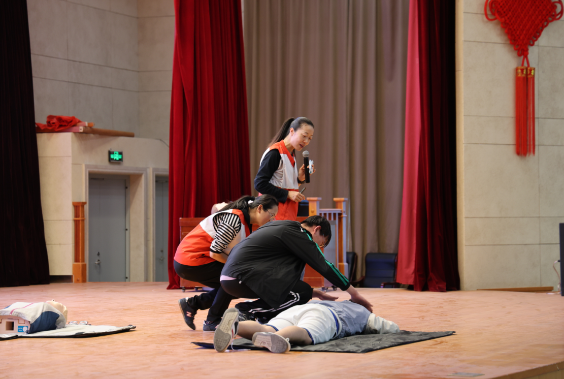 活動(dòng)初始,紅十字會(huì)培訓(xùn)老師向師生們介紹了紅十字會(huì)的起源發(fā)展、工作職責(zé)、標(biāo)志及“人道、博愛、奉獻(xiàn)”的紅十字會(huì)精神,使同學(xué)們對(duì)紅十字會(huì)有了初步了解。隨后,紅十字會(huì)培訓(xùn)老師結(jié)合理論知識(shí)和實(shí)際救護(hù)技巧對(duì)生活中遇到突發(fā)狀況急救、徒手心肺復(fù)蘇、溺水緊急救護(hù)等內(nèi)容作了詳細(xì)的講解。為了使師生們更加深入的了解各項(xiàng)救護(hù)技巧、掌握心肺復(fù)蘇要領(lǐng)、培訓(xùn)老師和師生們?cè)诂F(xiàn)場展開了深入互動(dòng),對(duì)心肺復(fù)蘇進(jìn)行了實(shí)操演練、手把手向同學(xué)們傳授了急救手法和注意事項(xiàng)。
