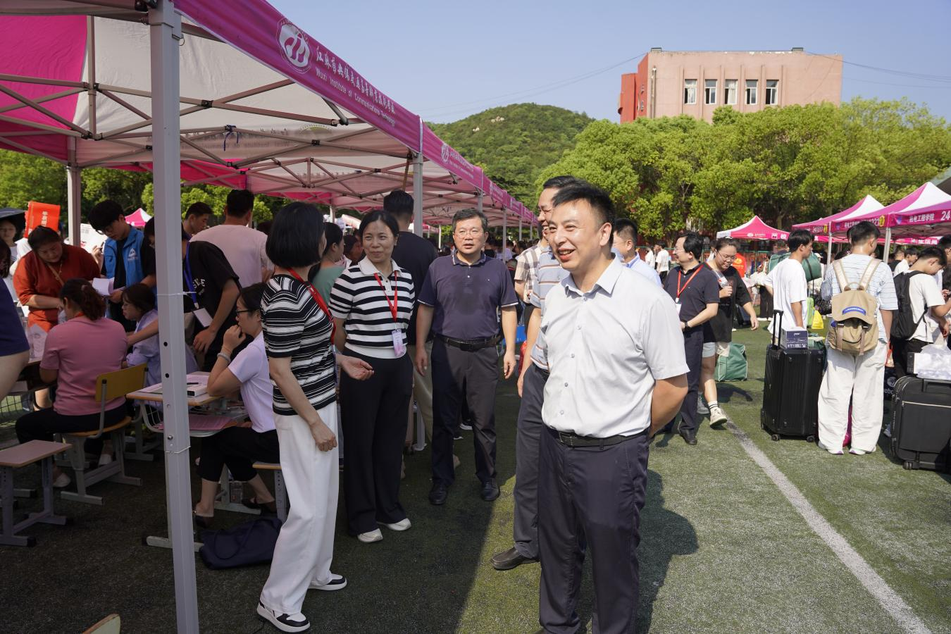 新生報到期間,學校黨委書記、校長李進等全體校領導來到迎新現(xiàn)場,深入新生報到各流程服務點、學生宿舍、食堂等了解迎新工作保障情況,與前來報到的新生和家長們親切交流。