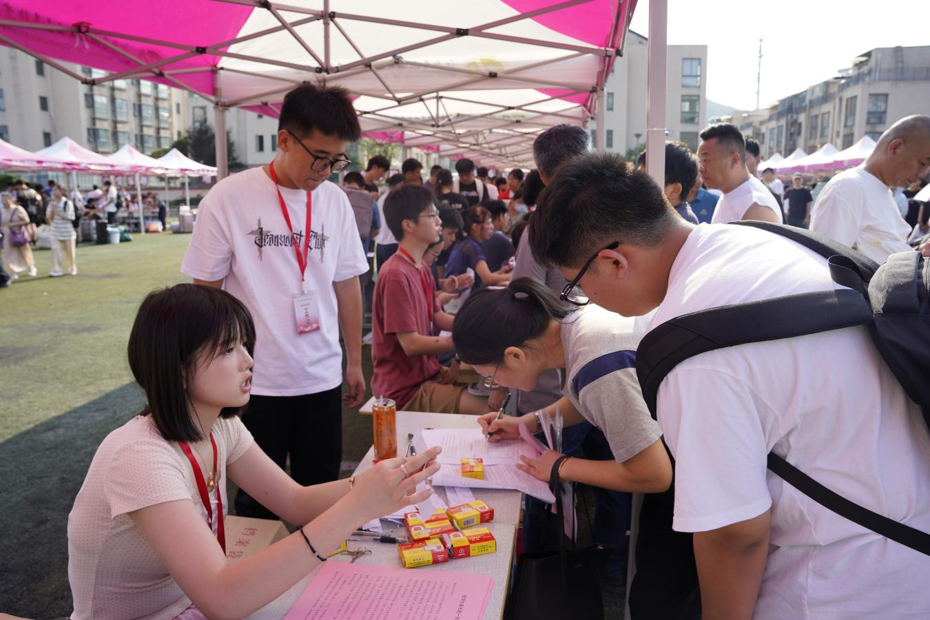 校園內形式多樣的宣傳展板吸引著新生和家長駐足留影,紛紛記錄與交校初次相遇的美好一刻。