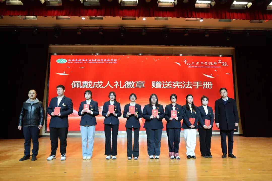 盛姣老師從職業(yè)教育使命出發(fā),勉勵(lì)學(xué)生“把握學(xué)歷提升機(jī)遇,在技能報(bào)國(guó)之路上行穩(wěn)致遠(yuǎn)”。校友代表薛子駿結(jié)合自身成長(zhǎng)經(jīng)歷,分享“終身學(xué)習(xí)”的重要性,引發(fā)共鳴。傣族舞《喜水》以靈動(dòng)舞姿為儀式注入青春活力,彰顯多元校園文化。 在莊重的成人禮環(huán)節(jié),教務(wù)處、學(xué)生工作處教師為學(xué)子佩戴成人禮徽章并贈(zèng)送憲法手冊(cè),象征法律賦予的權(quán)利與義務(wù)。張龍枝老師帶領(lǐng)全體學(xué)生面向國(guó)旗宣誓,誓言錚錚,回蕩禮堂。