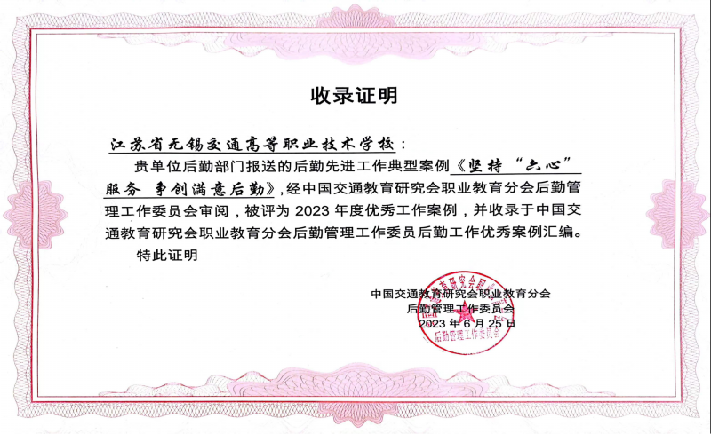 近日,中國(guó)交通教育研究會(huì)公布了2023年度后勤工作優(yōu)秀案例評(píng)選結(jié)果。學(xué)校后勤管理處提交的《堅(jiān)持“六心”服務(wù) 爭(zhēng)創(chuàng)滿意后勤》案例,從眾多參評(píng)案例中脫穎而出,被評(píng)為本年度的優(yōu)秀工作案例,并正式收錄入中國(guó)交通教育研究會(huì)職業(yè)教育分會(huì)后勤管理工作委員會(huì)的后勤工作優(yōu)秀案例匯編。