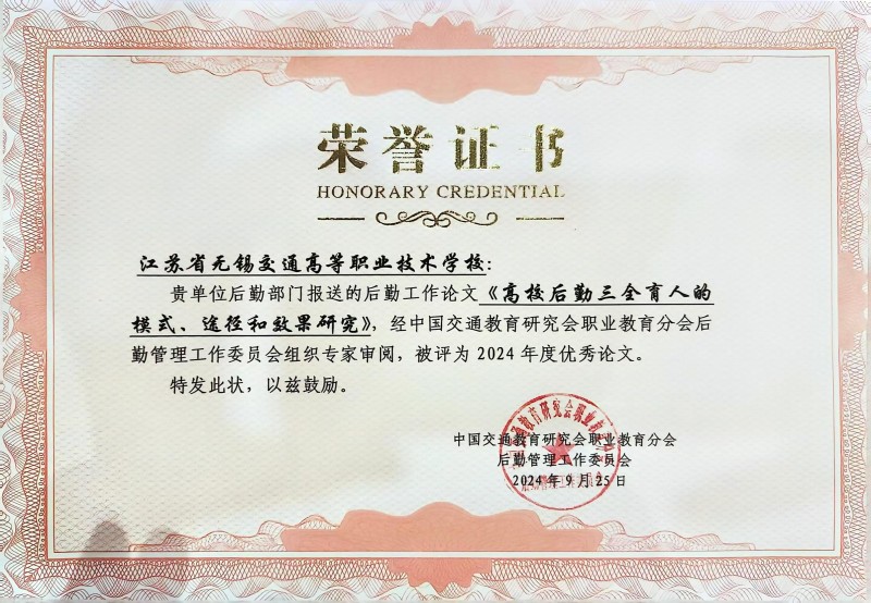 近日,由中國交通教育研究會職業(yè)教育分會后勤管理工作委員會組織的年度優(yōu)秀論文評選活動落下帷幕。經(jīng)過嚴(yán)格審閱和專家評審,學(xué)校后勤管理處投稿的論文《高校后勤三全育人的模式、途徑和效果研究》脫穎而出,榮獲2024年度優(yōu)秀論文稱號。