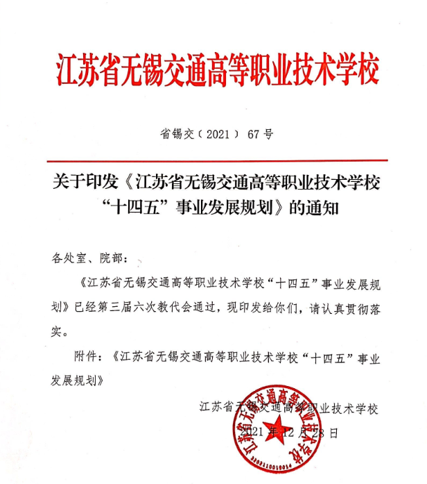 學(xué)校“十四五”規(guī)劃立足新發(fā)展階段,貫徹新發(fā)展理念,構(gòu)建新發(fā)展格局。全校師生將在“十四五”規(guī)劃引領(lǐng)下,凝心聚力、攻堅(jiān)克難,狠抓落實(shí)、干事開拓,奮力開創(chuàng)學(xué)校改革發(fā)展新局面,為交通運(yùn)輸現(xiàn)代化示范區(qū)建設(shè)和區(qū)域經(jīng)濟(jì)社會(huì)發(fā)展提供更高水平的技術(shù)技能人才支撐,共同譜寫學(xué)校各項(xiàng)事業(yè)輝煌發(fā)展的新篇章。