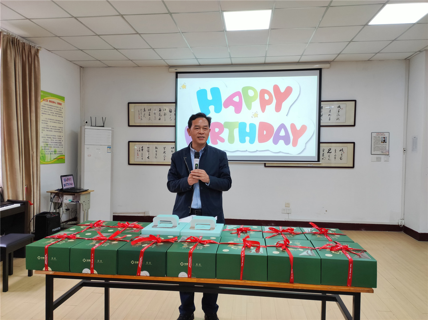 會上,行政二分工會主席巢建軍也為壽星們送上祝福?;A(chǔ)教學(xué)音樂教師周琪為大家獻歌一首,陪著母親堅守崗位的成玲老師的女兒,主動為壽星們唱生日歌!現(xiàn)場其樂融融。