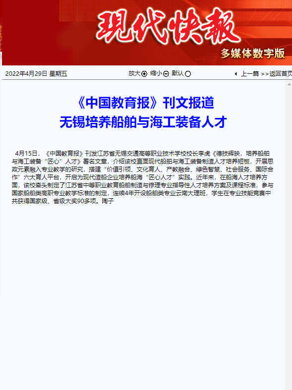 現(xiàn)代快報(bào):《中國教育報(bào)》刊文報(bào)道 無錫培養(yǎng)船舶與海工裝備人才
