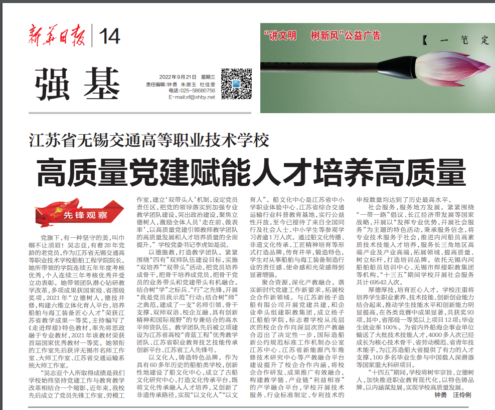 9月21日,《新華日?qǐng)?bào)》專(zhuān)版報(bào)道無(wú)錫交校黨建工作。全文如下:
