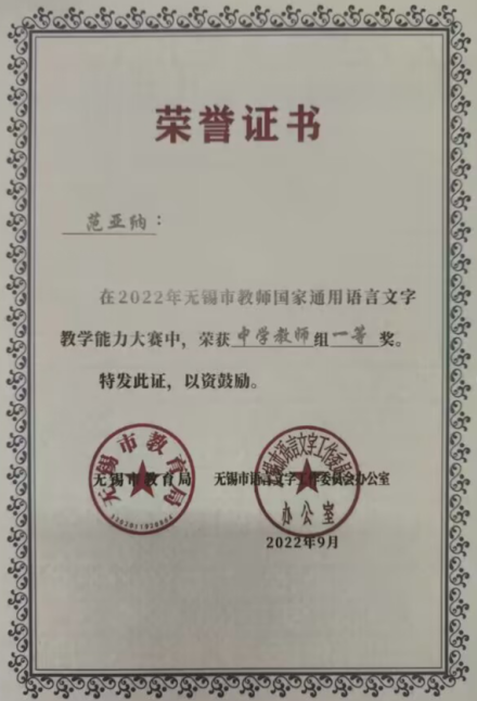 近日,基礎(chǔ)教學(xué)部范亞納老師在“2022年無錫市教師國家通用語言文字教學(xué)能力大賽”中,榮獲中學(xué)教師組一等獎!