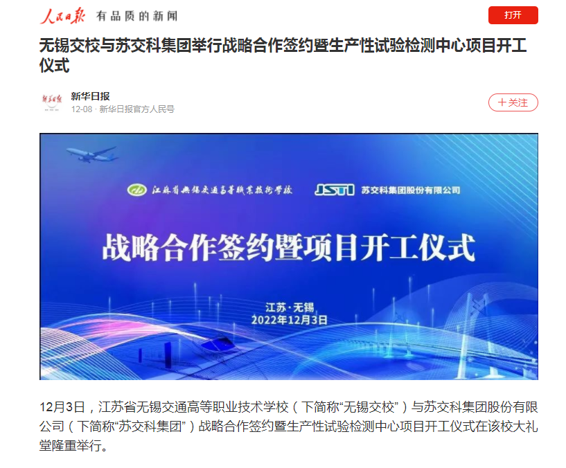 人民日?qǐng)?bào):無錫交校與蘇交科集團(tuán)舉行戰(zhàn)略合作簽約暨生產(chǎn)性試驗(yàn)檢測中心項(xiàng)目開工儀式