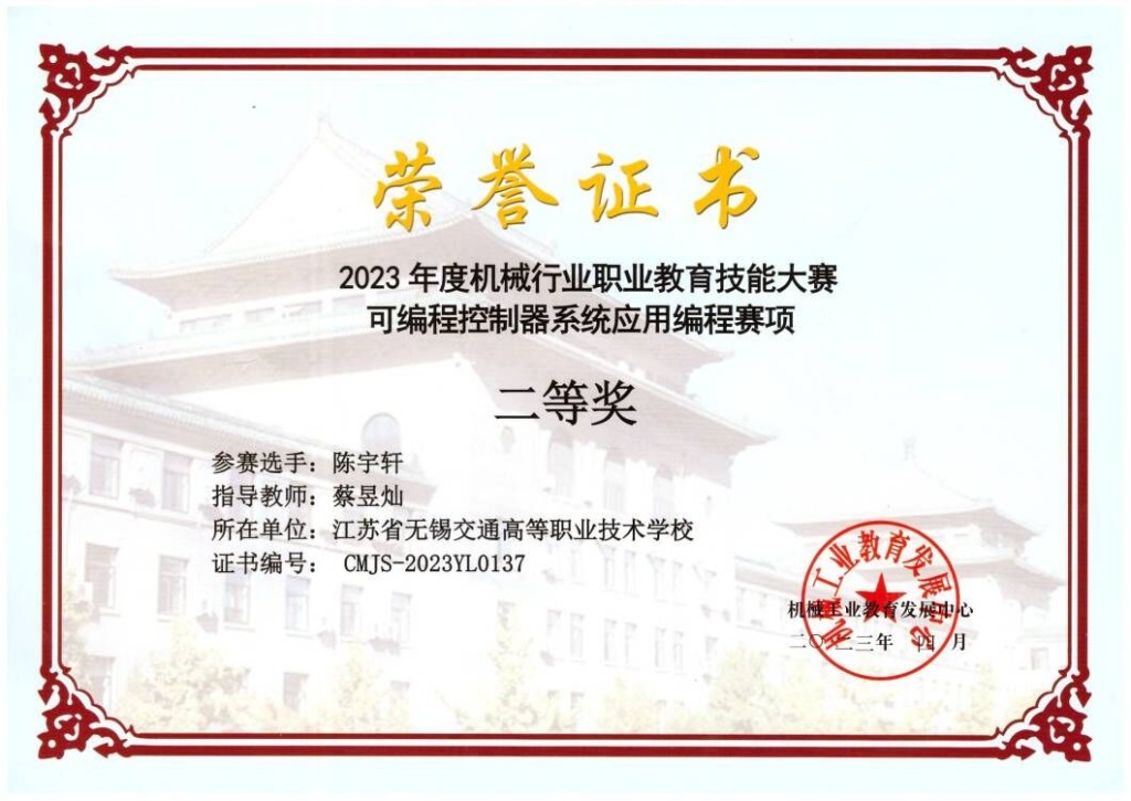 2023年4月6日-8號(hào),2023年全國機(jī)械行業(yè)職業(yè)教育技能大賽可編程控制器系統(tǒng)應(yīng)用編程賽項(xiàng)在南京工業(yè)職業(yè)大學(xué)舉行,此次大賽全國共有150支隊(duì)伍參賽。機(jī)電工程學(xué)院211324班陳宇軒同學(xué)代表學(xué)校參賽,經(jīng)過激烈角逐,獲中職組二等獎(jiǎng)。