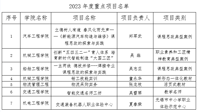 近日,無錫市教育局公布了無錫市職業(yè)教育質(zhì)量提升攀登計劃2023年度重點項目,我校11個項目入選:智能交通名師工坊認定為無錫市職業(yè)教育名師工坊;《立德樹人有道 春風(fēng)化雨無聲—<新能源汽車構(gòu)造與維修>》課程思政的探索與實踐》和《一主兩線 德技并修—焊接專業(yè)課程思政的探索與實踐》兩個項目認定為課程思政典型案例;《創(chuàng)新“五四三二一”育人體系 培育新時代智能制造“大國工匠”》被認定為職業(yè)素養(yǎng)和工匠精神教育典型案例;沈力輝、姚柯、陶建華、金學(xué)恒等4名同學(xué)認定為技能雛鷹;《鉗工技能實訓(xùn)》認定為新形態(tài)一體化教材;《物流采購實務(wù)》被認定為活頁式教材;交通裝備機器人職業(yè)體驗中心被認定為無錫市中小學(xué)職業(yè)體驗示范中心。
