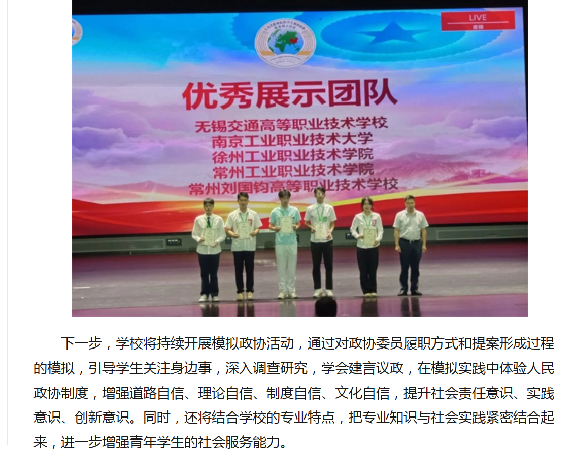 中江網(wǎng):江蘇省無錫交通高等職業(yè)技術(shù)學(xué)校在江蘇省首屆職業(yè)院校模擬政協(xié)提案展示活動中取得佳績