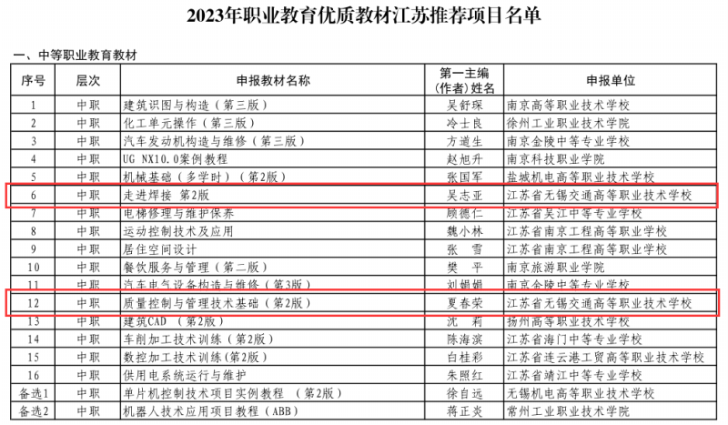 近日,省教育廳組織了2023年職業(yè)教育優(yōu)質(zhì)教材推薦申報工作,經(jīng)專家評審、教育廳公示,全省有16部教材入選,其中學(xué)校吳志亞教授主編的《走進焊接 第2版》和夏春榮教授主編的《質(zhì)量控制與管理技術(shù)基礎(chǔ)》2部教材入選2023年職業(yè)教育優(yōu)質(zhì)教材江蘇推薦正選項目,取得教材建設(shè)新突破。