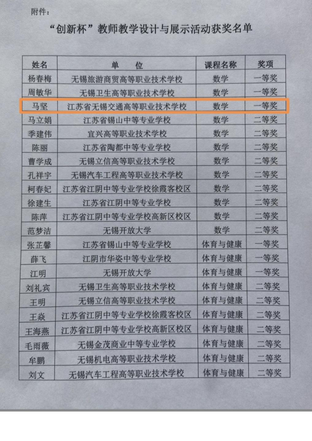 近日,無錫市教育科學(xué)研究院公布了2023年度無錫市職業(yè)學(xué)?!皠?chuàng)新杯”教師教學(xué)設(shè)計(jì)與展示活動(dòng)的結(jié)果?;A(chǔ)教學(xué)部馬堅(jiān)老師榮獲一等獎(jiǎng)。
