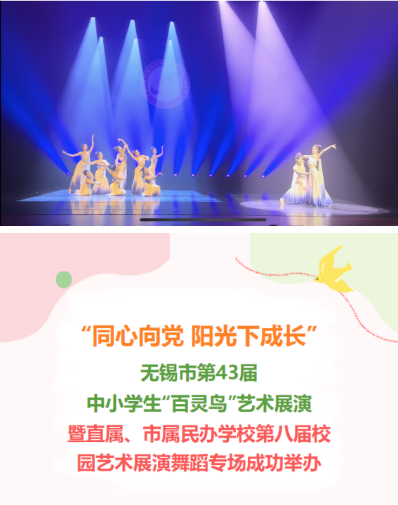 2024年無錫市第43屆中小學(xué)生“百靈鳥”藝術(shù)展演暨直屬、市屬民辦學(xué)校第八屆校園藝術(shù)展于5月14日在無錫青少年宮舉行。經(jīng)過精彩的表演和激烈的角逐,郭曉琳、王濤老師指導(dǎo)的課本劇《喜被》榮獲金獎(jiǎng),朗誦《先鋒力量薪火相傳》榮獲銀獎(jiǎng),楊格格老師指導(dǎo)的舞蹈《云之南》榮獲銀獎(jiǎng),展現(xiàn)了學(xué)校美育教育的豐碩成果和學(xué)生們的卓越才藝。