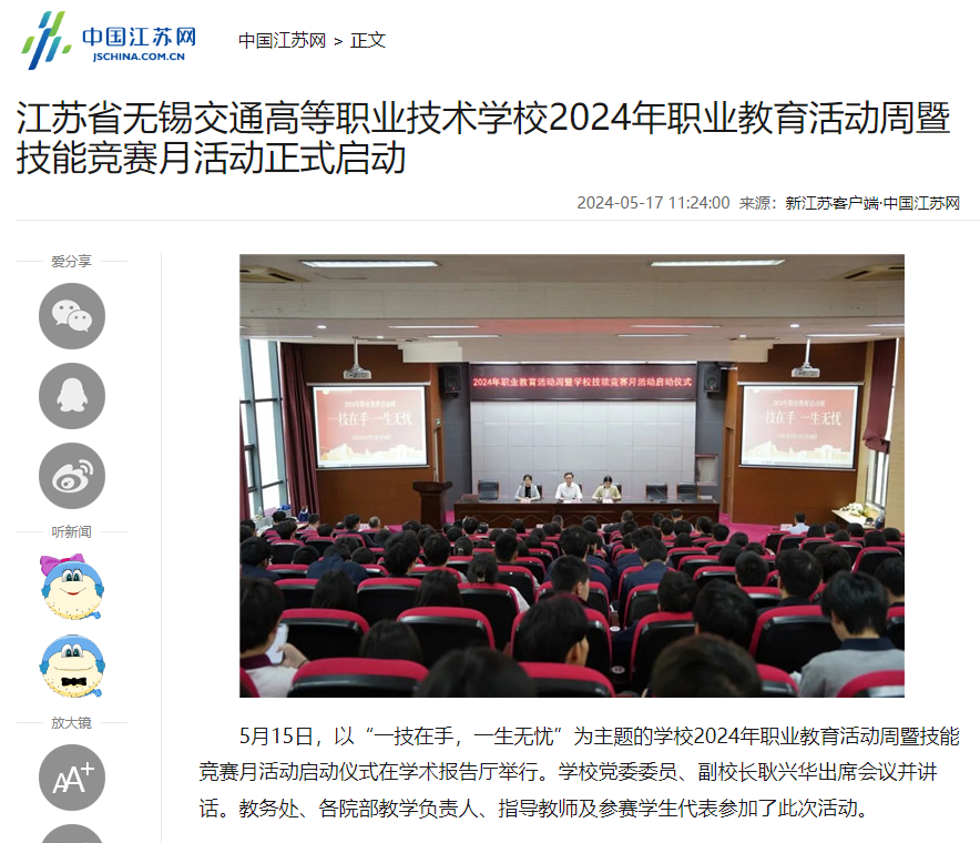中江網(wǎng):江蘇省無(wú)錫交通高等職業(yè)技術(shù)學(xué)校2024年職業(yè)教育活動(dòng)周暨技能競(jìng)賽月活動(dòng)正式啟動(dòng)