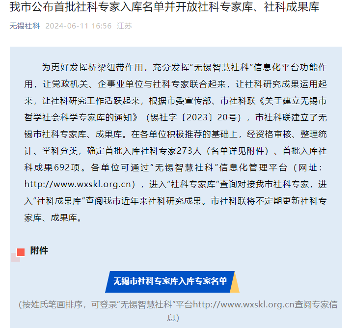 此次專家遴選入庫活動(dòng)自2023年10月開始籌辦,由無錫市委宣傳部、市社會(huì)科學(xué)界聯(lián)合會(huì)組織。在各單位推薦的基礎(chǔ)上,經(jīng)資格審核、整理統(tǒng)計(jì)、學(xué)科分類,專家評(píng)審,最終確定首批入庫社科專家273人。
