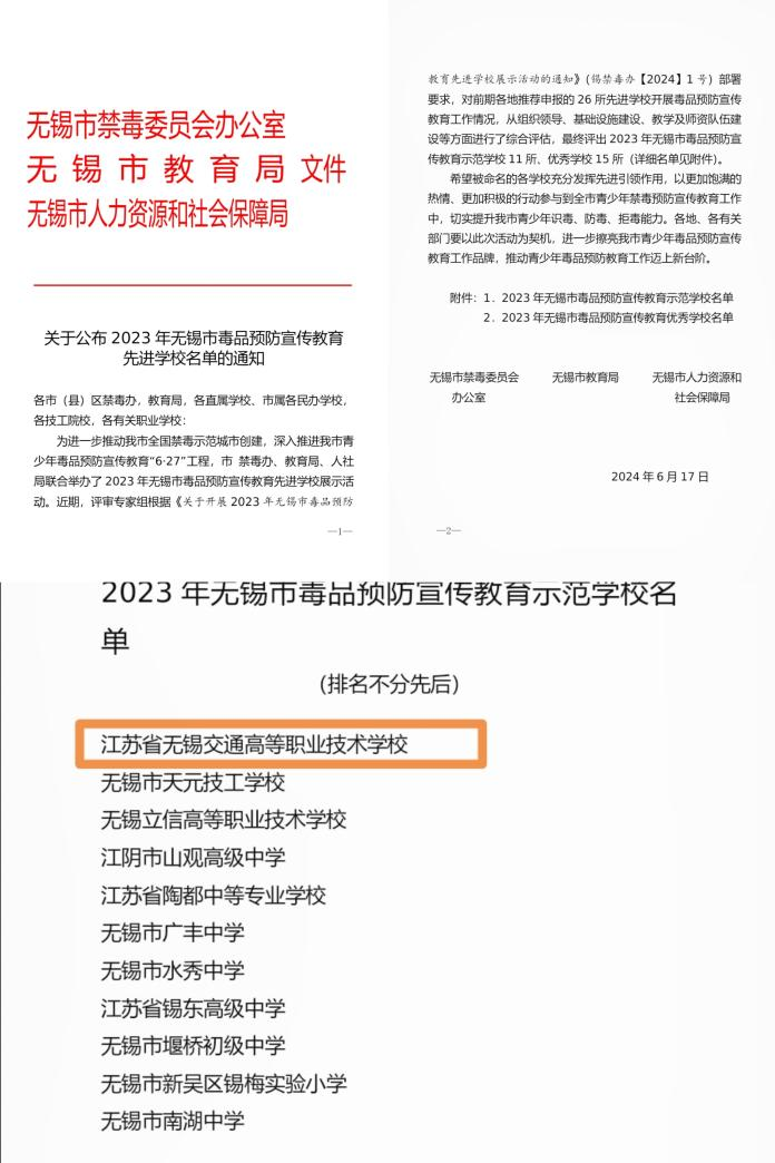 近期,在市禁毒辦、教育局、人社局聯(lián)合舉辦的2023年無錫市毒品預(yù)防宣傳教育示范學(xué)校展示活動當(dāng)中,學(xué)校被評為2023年無錫市毒品預(yù)防宣傳教育示范學(xué)校。