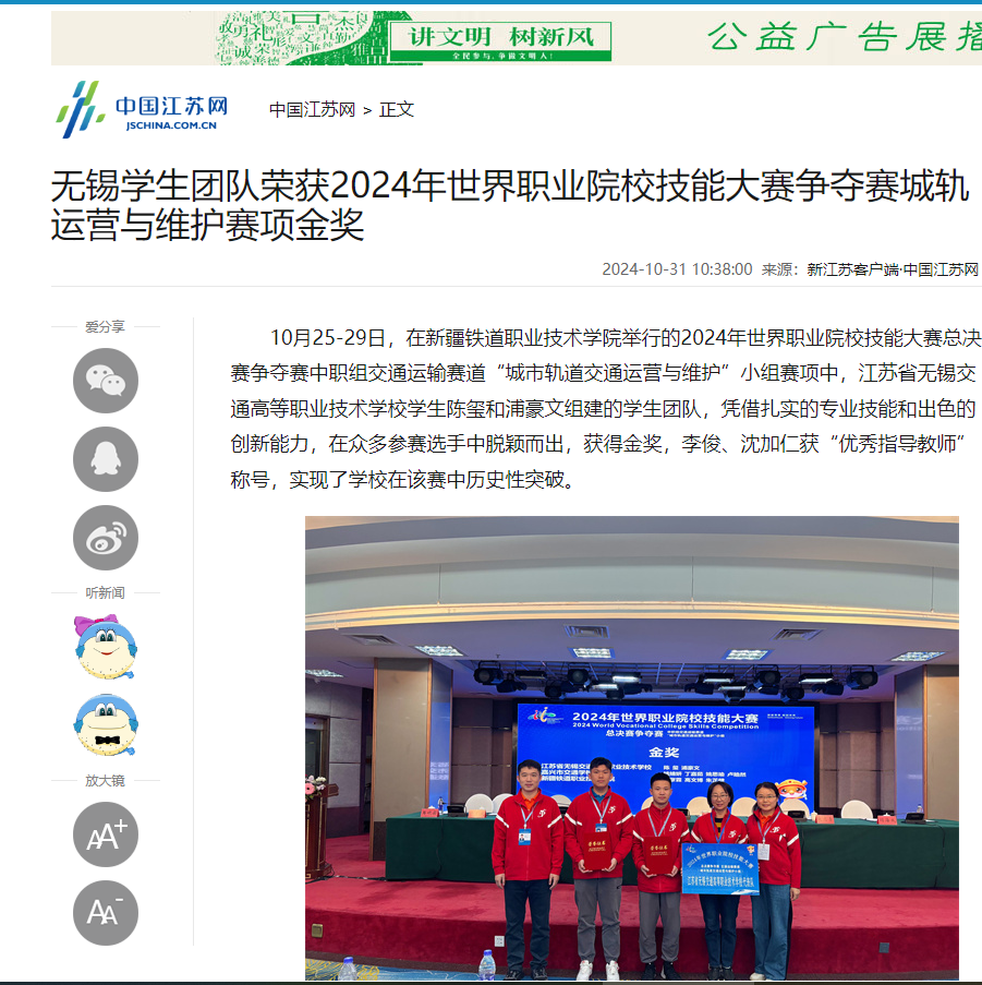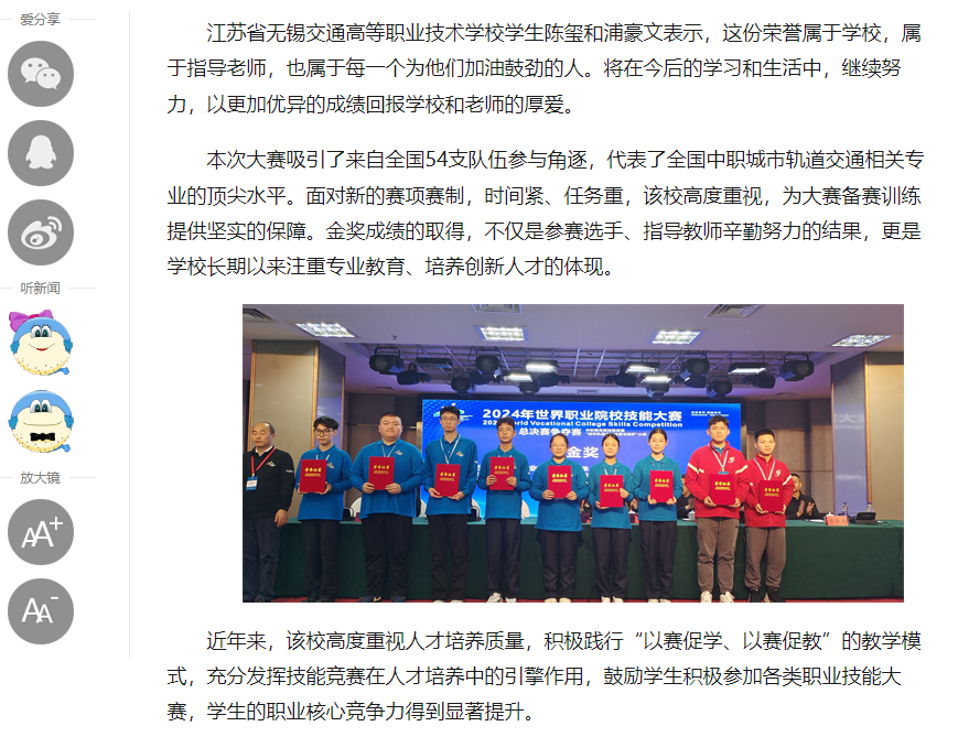 學(xué)習(xí)強(qiáng)國(guó)江蘇學(xué)習(xí)平臺(tái):無錫學(xué)生團(tuán)隊(duì)榮獲2024年世界職業(yè)院校技能大賽爭(zhēng)奪賽城軌運(yùn)營(yíng)與維護(hù)賽項(xiàng)金獎(jiǎng)