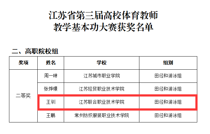 近日,由江蘇省教育廳主辦的江蘇省第三屆高校體育教師教學(xué)基本功大賽在南京工業(yè)大學(xué)和南京信息職業(yè)技術(shù)學(xué)院舉行。本次大賽共有全省141所高校310名教師參賽。我校王訓(xùn)老師憑借出色的專業(yè)素養(yǎng)和教學(xué)能力,在眾多參賽教師中脫穎而出,獲得二等獎的好成績,實(shí)現(xiàn)學(xué)校在該賽事中的歷史性突破,展現(xiàn)我校體育教師扎實(shí)的專業(yè)素養(yǎng)和良好的教學(xué)水平。