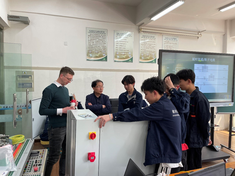 第一天的課程為陳靜老師講授的工業(yè)機(jī)電師吊橋裝置(PLC編程技術(shù))。課上,陳老師采用理實(shí)一體化教學(xué)方式教授學(xué)生如何編寫PLC程序,并通過(guò)電機(jī)設(shè)備進(jìn)行驗(yàn)證、調(diào)試。課后,外教與陳靜老師進(jìn)行了交流,同時(shí),對(duì)學(xué)院中德實(shí)訓(xùn)室的建設(shè)提出了寶貴的建議。