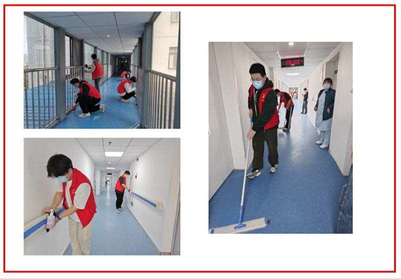 一部分同學(xué)前往病房幫患者推車、洗腳,聊天或協(xié)助家屬推病患進(jìn)出電梯,給予他們溫暖和關(guān)懷;另一部分同學(xué)則在幫忙打掃環(huán)境衛(wèi)生,讓醫(yī)護(hù)人員和患者擁有一個(gè)明亮干凈的環(huán)境。