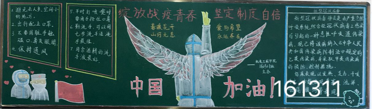 為全面打贏新冠肺炎疫情阻擊戰(zhàn),做好抗疫知識(shí)宣傳,5月13日,機(jī)電工程學(xué)院舉辦了以“綻放戰(zhàn)疫青春,堅(jiān)定制度自信”為主題的黑板報(bào)評(píng)比活動(dòng),此次活動(dòng)共有18個(gè)班級(jí)參加。
