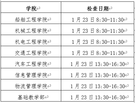 1.檢查時間安排:1月21日教研室自查;1月22日院(部)抽查;1月23日學校檢查。學校檢查日程安排如下: