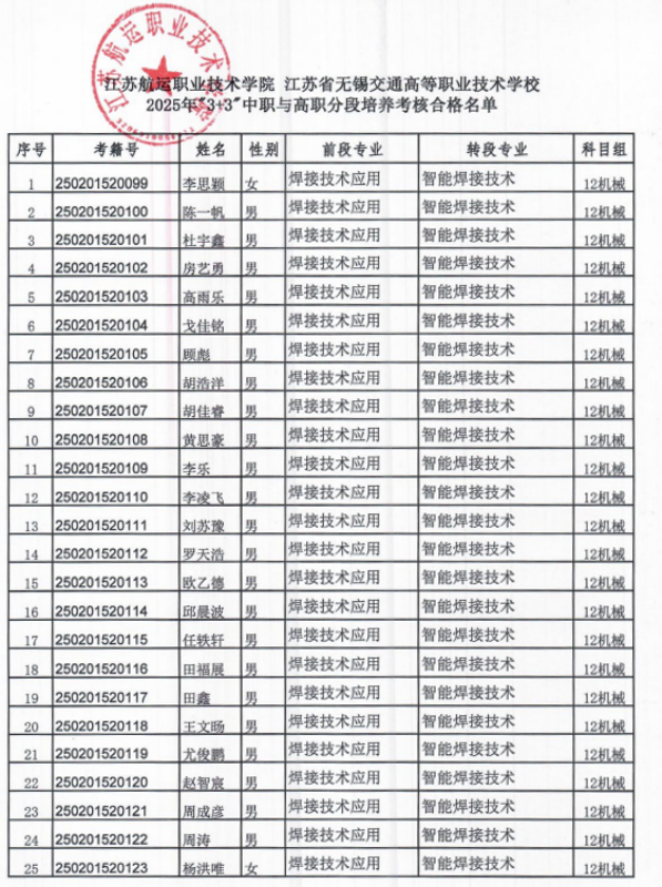 根據(jù)學(xué)校與江蘇航運(yùn)職業(yè)技術(shù)學(xué)院關(guān)于2022級(jí)焊接技術(shù)應(yīng)用專業(yè)中高職“3+3”分段培養(yǎng)項(xiàng)目的合作規(guī)定,以及《關(guān)于進(jìn)一步完善現(xiàn)代職業(yè)教育體系建設(shè)試點(diǎn)項(xiàng)目轉(zhuǎn)段升學(xué)工作的意見(jiàn)(試行)》(蘇教職[2014]31 號(hào))、《江蘇航運(yùn)職業(yè)技術(shù)學(xué)院與中等專業(yè)學(xué)校“3+3”分段培養(yǎng)試點(diǎn)項(xiàng)目轉(zhuǎn)段辦法》的要求,11月15日經(jīng)江蘇航運(yùn)職業(yè)技術(shù)學(xué)院對(duì)我校2022級(jí)焊接技術(shù)應(yīng)用專業(yè)212121班(3+3)學(xué)生進(jìn)行了轉(zhuǎn)段考核,李思穎等25名同學(xué)滿足中高職銜接的高職入學(xué)條件。