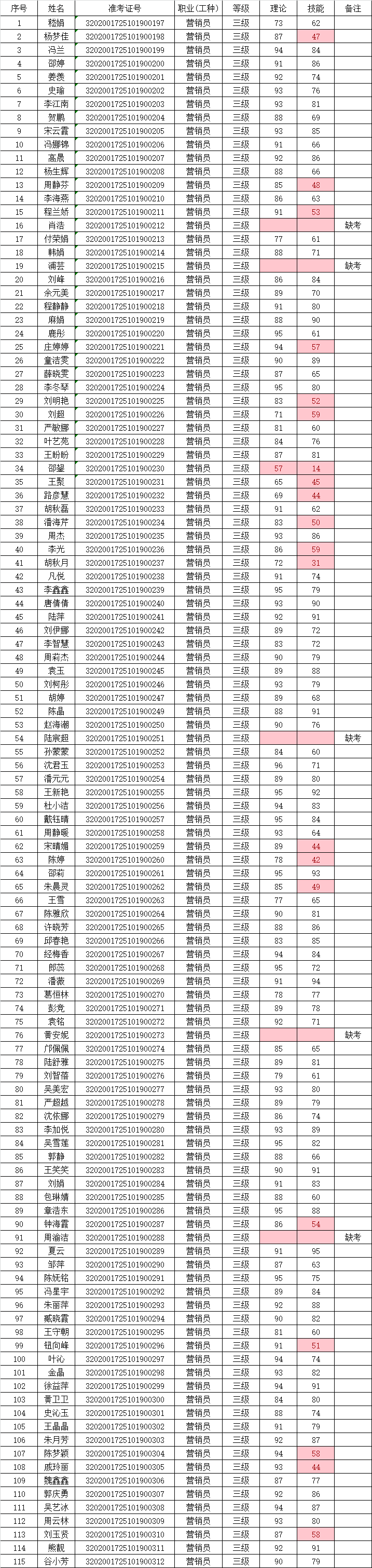 2025年10月19日,115名企業(yè)人員參加營(yíng)銷(xiāo)員三級(jí)技能等級(jí)認(rèn)定考試(考試批次:2025-32020017-00037),共計(jì)90名成績(jī)獲得合格?,F(xiàn)將考試成績(jī)公示如下: