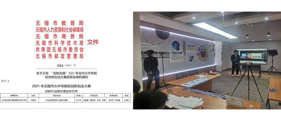 汽車工程學院201511班汪文俊、唐學靖和王旭三名同學在石松偉、張家梅老師帶領指導下,2022年4月18日-22日,參加了由無錫市教育局、人社局、商務局、科技局、共青團無錫市委員會、郵政局聯合線上舉辦的"創(chuàng)響無錫"2021年無錫市大中專院校創(chuàng)新創(chuàng)業(yè)大賽。