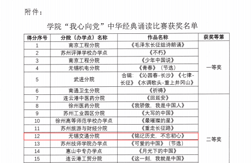 為弘揚中華優(yōu)秀語言文化,歌頌建黨百年光輝歷程,彰顯舉世矚目偉大成就,增強愛黨愛國情懷。江蘇聯(lián)合職業(yè)技術(shù)學(xué)院開展了“我心向黨”中華經(jīng)典誦讀比賽活動,根據(jù)《關(guān)于公布學(xué)院“我心向黨”中華經(jīng)典誦讀比賽獲獎名單通知》,我校節(jié)目《銘記歷史 不忘初心》榮獲二等獎。