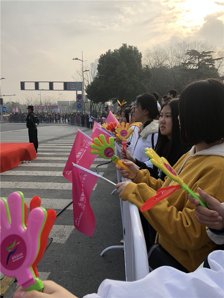 無錫交校志愿者以良好的精神風貌整齊的排列在賽道上,手持賽會旗和鼓掌器,為參賽選手加油助威。我校志愿者看著三萬名選手耗時半小時陸續(xù)跑過起跑線,有的有的健步如飛,有的個性飛揚,我校的同學們瞬間沸騰,發(fā)出帶有青春活力和充滿激情的助威聲,當部分殘疾人選手推著輪椅通過時,同學們紛紛投去了敬佩的目光。
