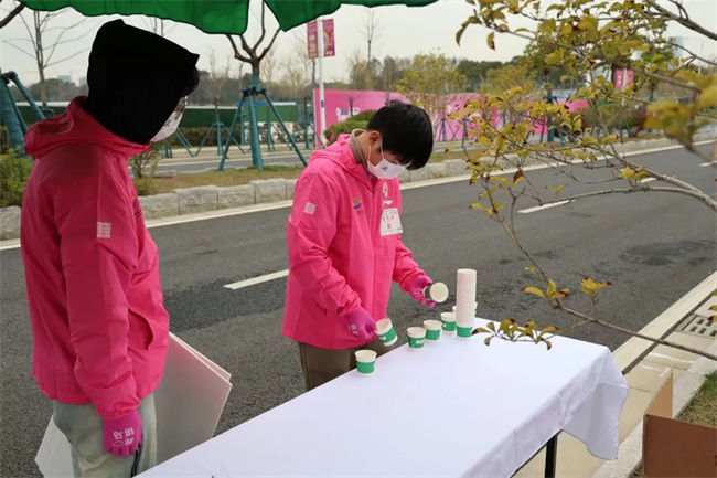不到七點,交校的青年志愿者們已經(jīng)到達指定地點,在賽事專員的指導(dǎo)下,完成飲料桌、食品桌、海綿桌上物品的擺放,做好前期的準備工作。在學(xué)校,他們是努力認真的學(xué)習(xí)者,在櫻花賽道,他們是最美的服務(wù)者。