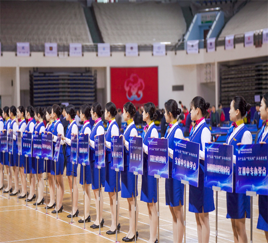 指引組主要由學(xué)校船舶工程學(xué)院航空服務(wù)專業(yè)80名學(xué)生擔(dān)任,他們身著天空藍(lán)制服,在賽場入口指引參賽隊員入場、在開幕式現(xiàn)場舉起手舉牌為參賽隊伍定位、在道路旁為參賽人員引路……成為乒乓球賽場的藍(lán)色風(fēng)景線。