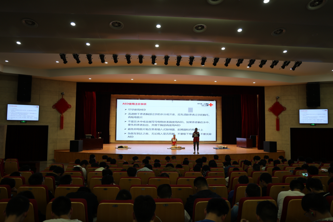 活動(dòng)初始,紅十字會(huì)培訓(xùn)老師向師生們介紹了紅十字會(huì)的起源發(fā)展、工作職責(zé)、標(biāo)志及“人道、博愛、奉獻(xiàn)”的紅十字會(huì)精神,使同學(xué)們對(duì)紅十字會(huì)有了初步了解。隨后,紅十字會(huì)培訓(xùn)老師結(jié)合理論知識(shí)和實(shí)際救護(hù)技巧對(duì)生活中遇到突發(fā)狀況急救、徒手心肺復(fù)蘇、溺水緊急救護(hù)等內(nèi)容作了詳細(xì)的講解。為了使師生們更加深入的了解各項(xiàng)救護(hù)技巧、掌握心肺復(fù)蘇要領(lǐng)、培訓(xùn)老師和師生們?cè)诂F(xiàn)場展開了深入互動(dòng),對(duì)心肺復(fù)蘇進(jìn)行了實(shí)操演練、手把手向同學(xué)們傳授了急救手法和注意事項(xiàng)。