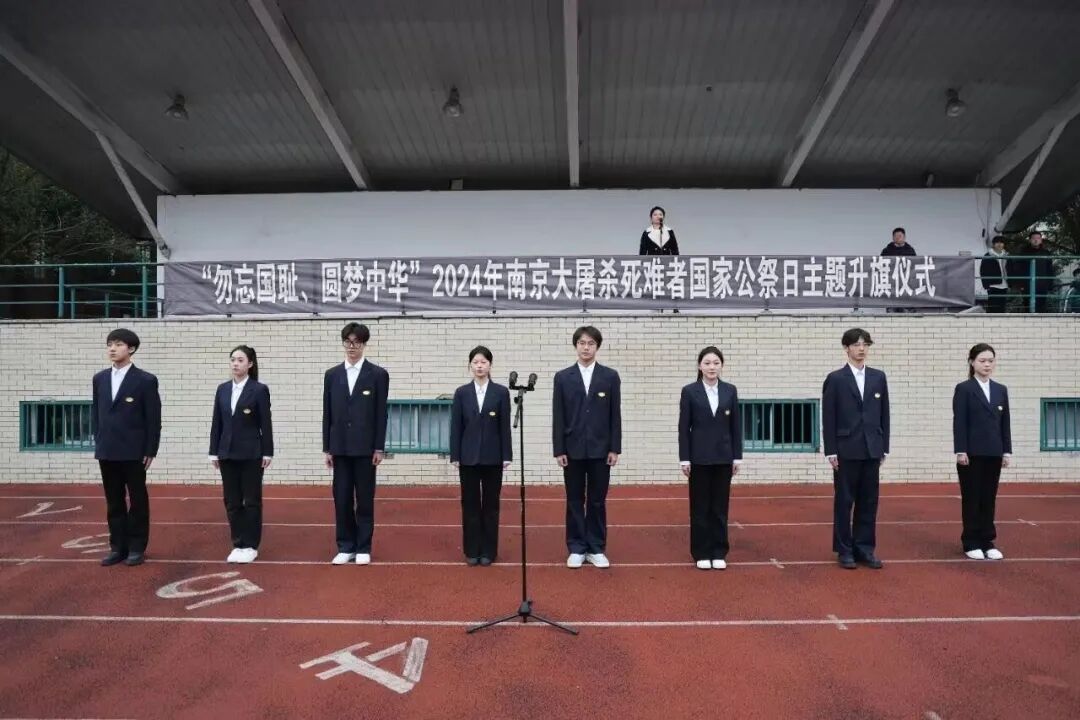 2024年12月13日,學校師生齊聚操場,舉行“勿忘國恥,圓夢中華”——第11個南京大屠殺死難者國家公祭日主題升旗儀式,引導同學們銘記歷史,珍惜和平,居安思危,砥礪前行。校黨委委員、副校長王玨出席儀式并講話,全校師生代表1500余人參加了升旗儀式。