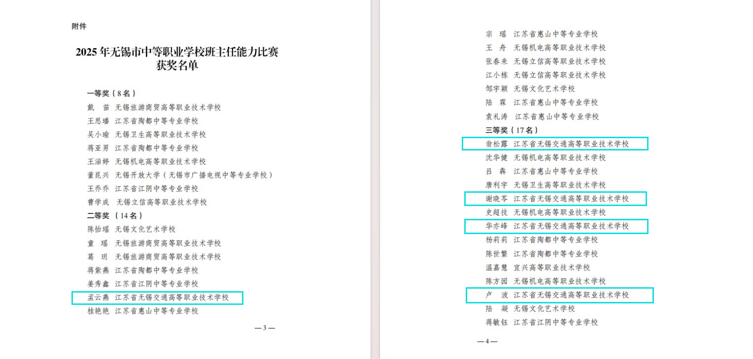 在剛剛落幕的2025年無錫市中等職業(yè)學(xué)校班主任能力比賽中,經(jīng)過激烈角逐,學(xué)校參賽教師表現(xiàn)優(yōu)異,5名教師全部獲獎,其中1名教師獲得二等獎,4名教師獲得三等獎。展現(xiàn)了學(xué)校班主任隊伍過硬的專業(yè)素養(yǎng)和育人水平,為學(xué)校贏得了榮譽。
