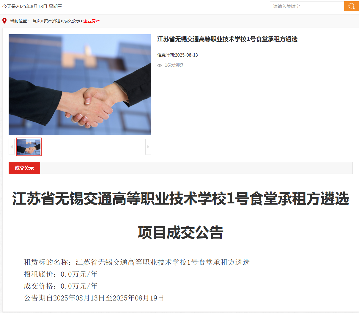 江蘇省無錫交通高等職業(yè)技術(shù)學(xué)校1號食堂承租方遴選項(xiàng)目成交公告